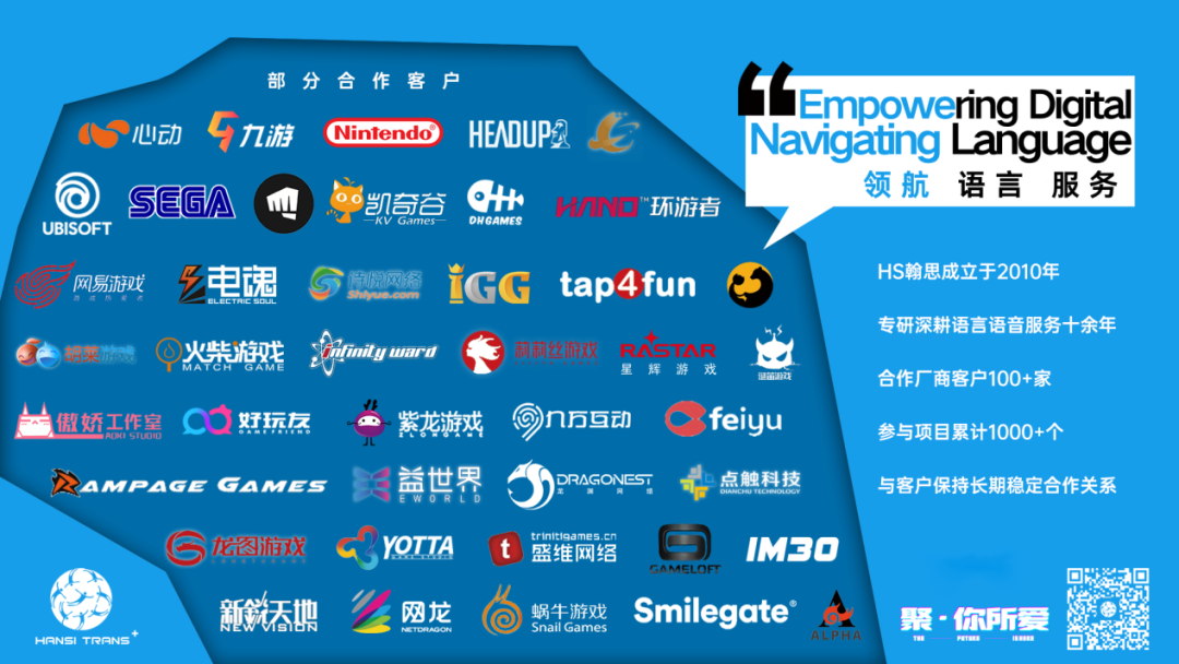 值此盛事,HS翰思语创(以下简称“我司”)正式确认参展2025 ChinaJoy BTOB商务洽谈馆。作为全球多语种翻译与语音服务领域的领军企业,我司将携“游戏本地化全链路解决方案”亮相,展示其在ACG领域语言服务、多语种配音及全球化IP运营的核心竞争力,赋能企业高效出海。